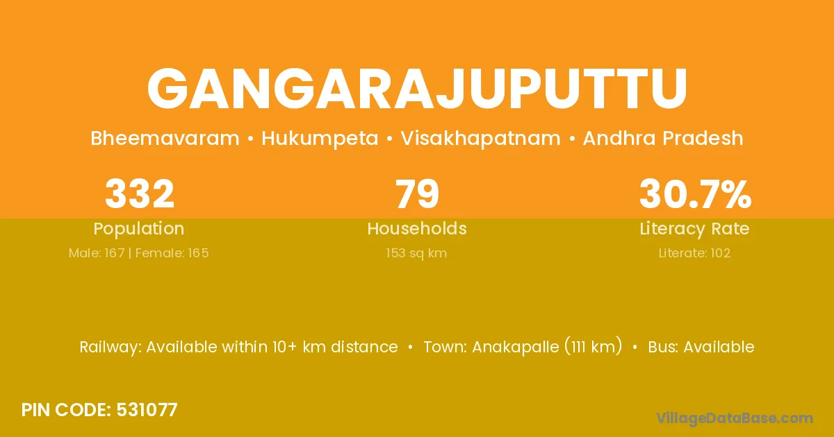 Anakapalle (111 km) is the nearest town to Gangarajuputtu village for major economic activities and is located approximately 111 km away.
