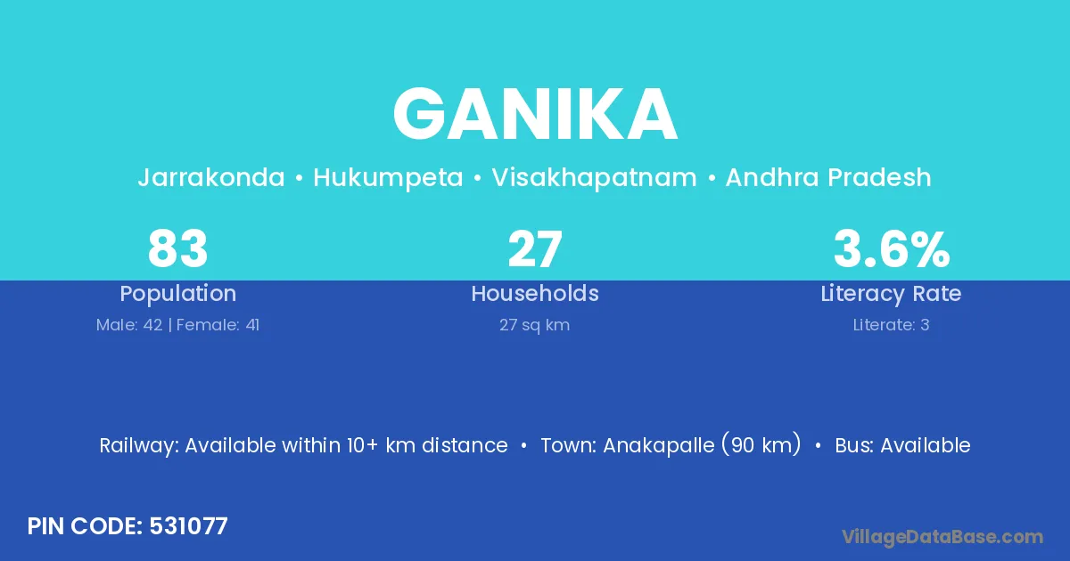 Anakapalle (90 km) is the nearest town to Ganika village for major economic activities and is located approximately 90 km away.