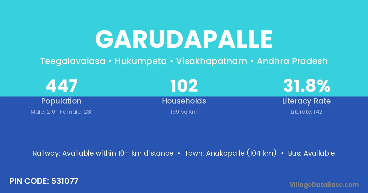Garudapalle village has a total population of 447 people, of which 216 are males and 231 are females.