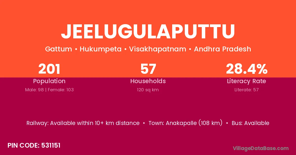 Jeelugulaputtu village has a total population of 201 people, of which 98 are males and 103 are females.