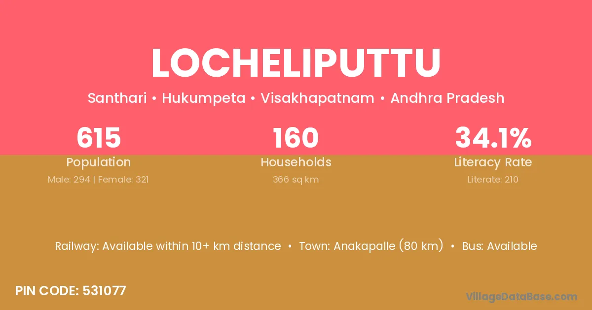 Anakapalle (80 km) is the nearest town to Locheliputtu village for major economic activities and is located approximately 80 km away.
