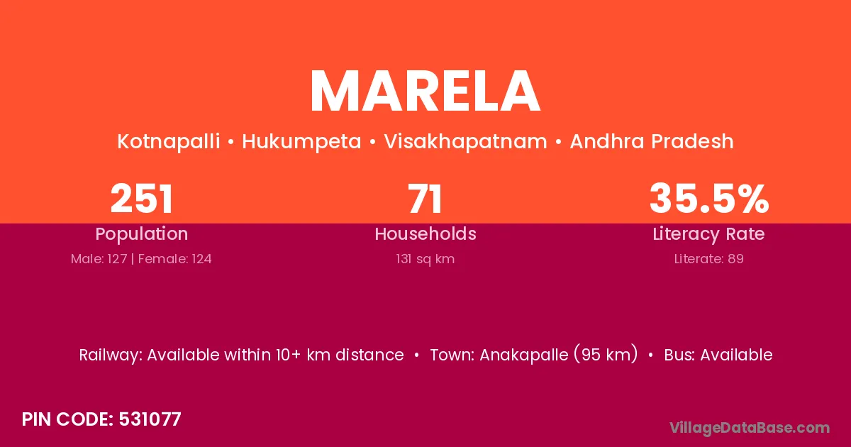 Anakapalle (95 km) is the nearest town to Marela village for major economic activities and is located approximately 95 km away.