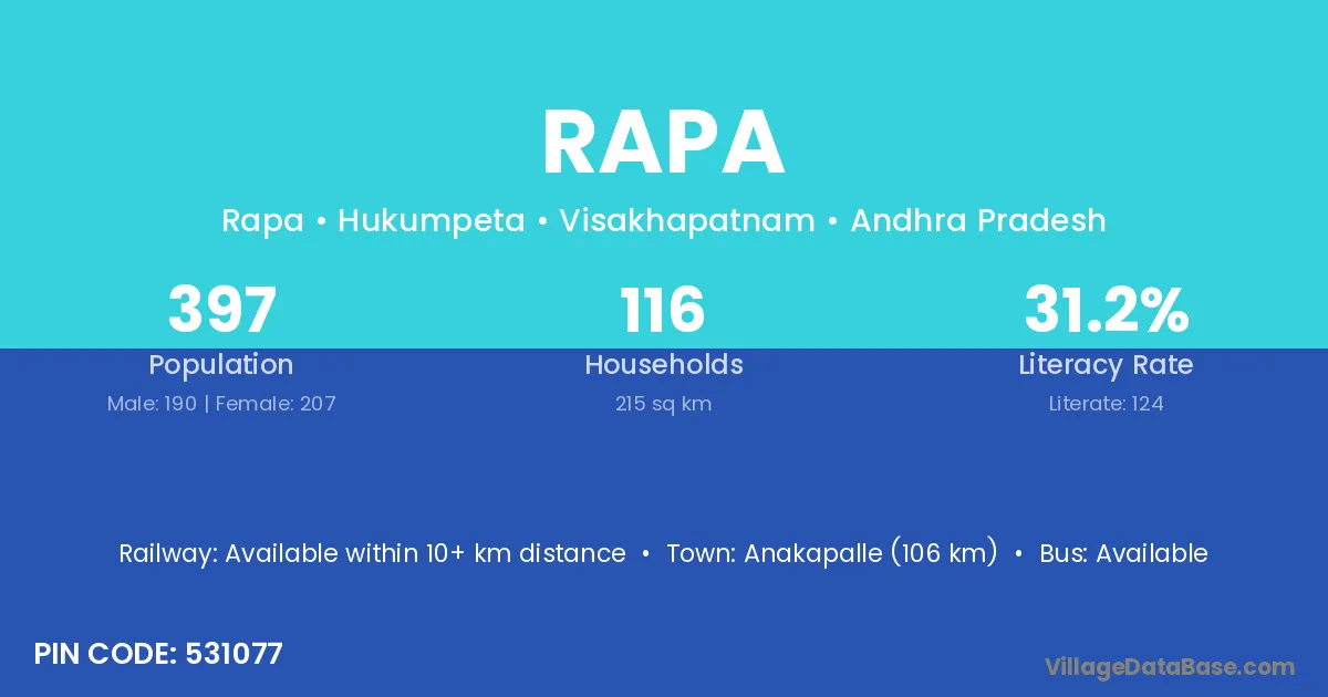 Anakapalle (106 km) is the nearest town to Rapa village for major economic activities and is located approximately 106 km away.