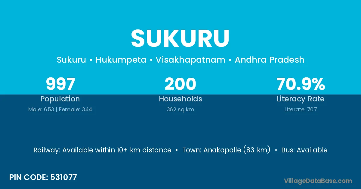 Anakapalle (83 km) is the nearest town to Sukuru village for major economic activities and is located approximately 83 km away.