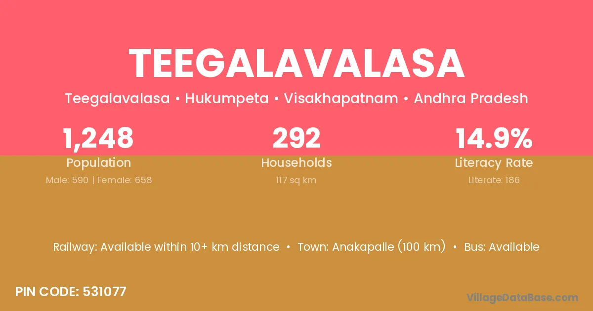 Teegalavalasa village has a total population of 1,248 people, of which 590 are males and 658 are females.