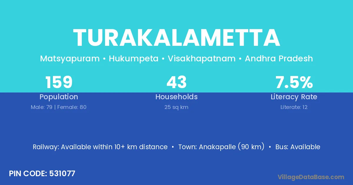 Anakapalle (90 km) is the nearest town to Turakalametta village for major economic activities and is located approximately 90 km away.