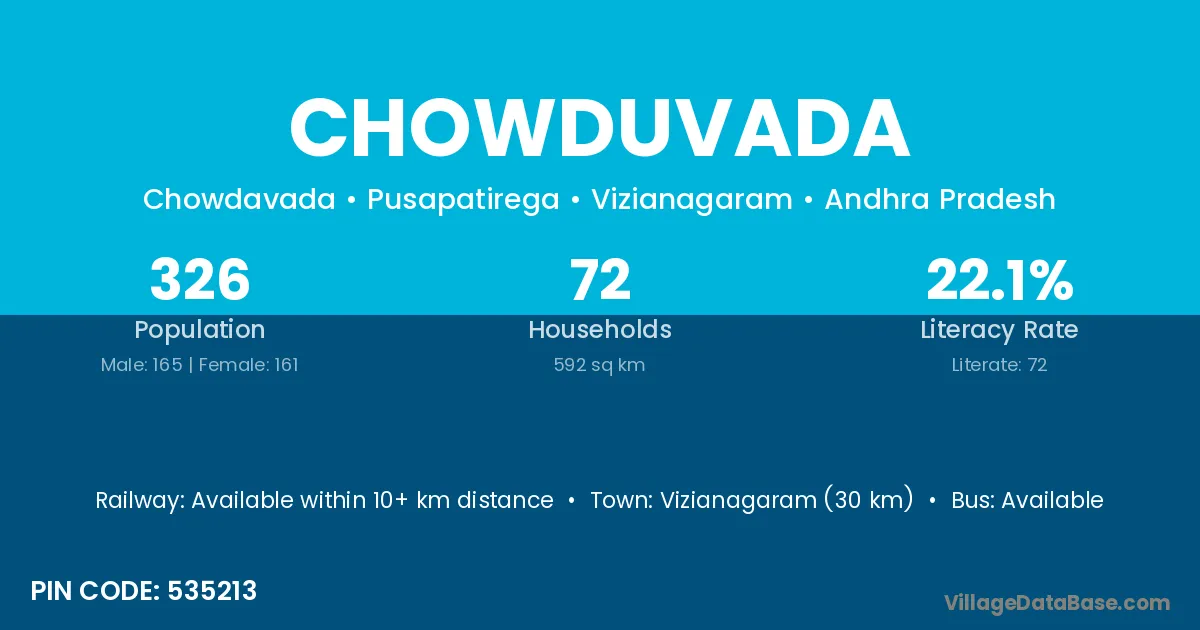 The literacy rate of Chowduvada village is 49.02%. Male literacy stands at 58.48% and female literacy at 39.56%.