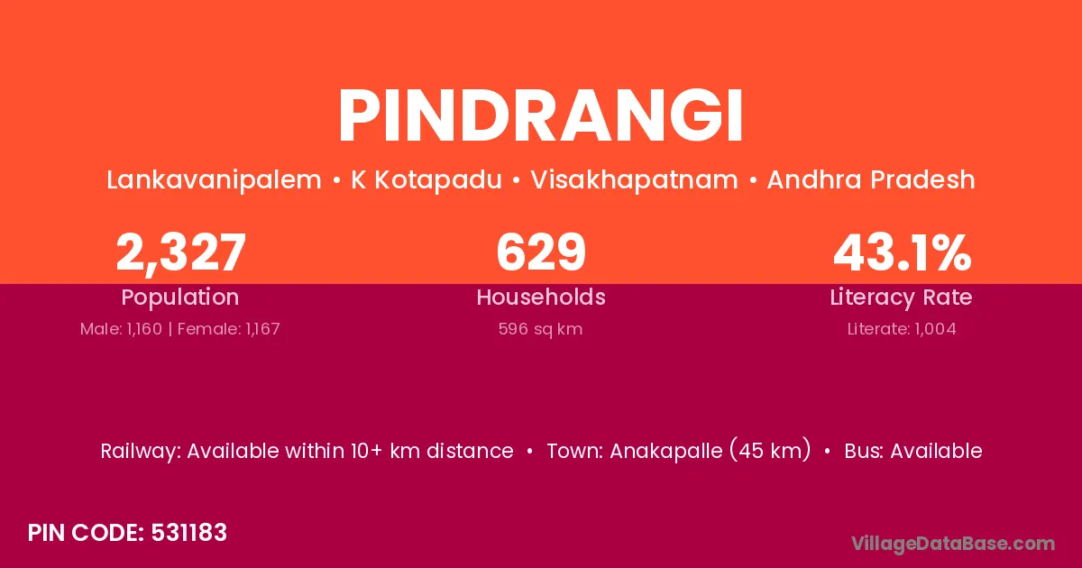 Anakapalle (45 km) is the nearest town to Pindrangi village for major economic activities and is located approximately 45 km away.