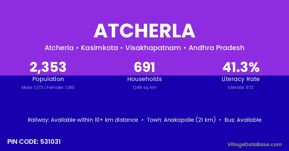 Anakapalle (21 km) is the nearest town to Atcherla village for major economic activities and is located approximately 21 km away.