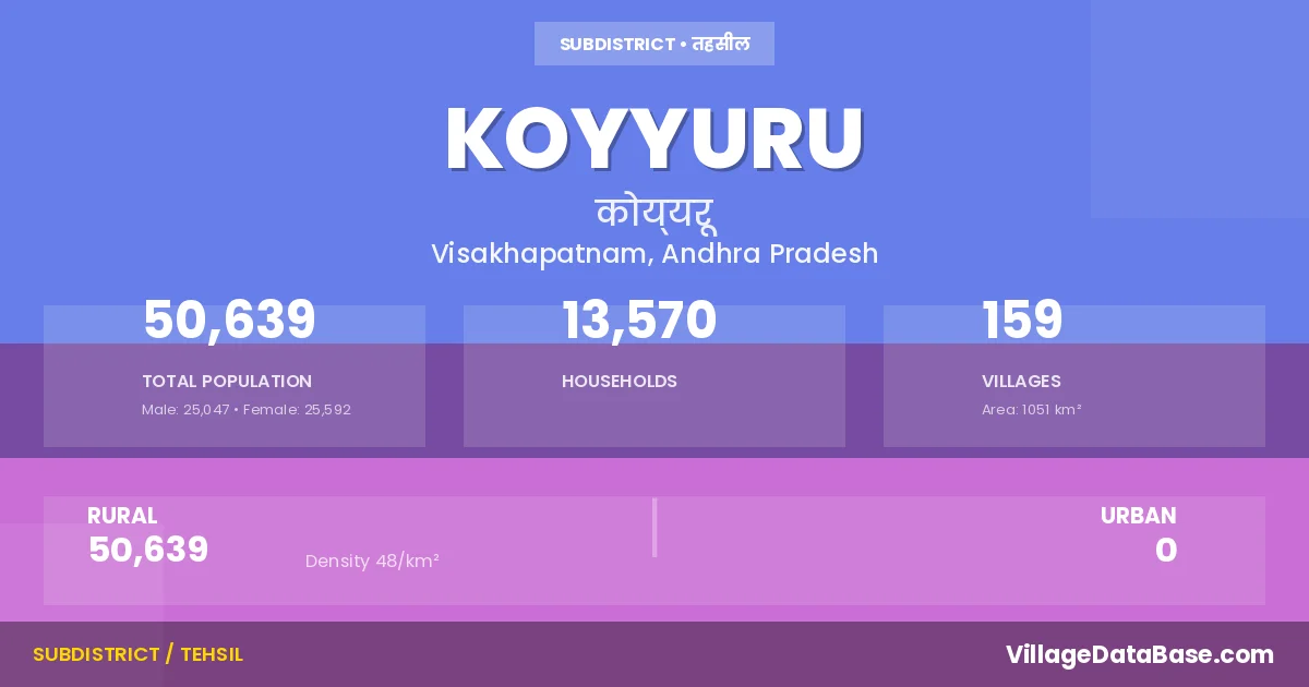 According to the 2011 census The total area of Koyyuru Mandal is 1051 km², with a population of 50639 people. The population density is 48 inhabitants per square kilometre, and there are approximately 13570 houses in the sub district.