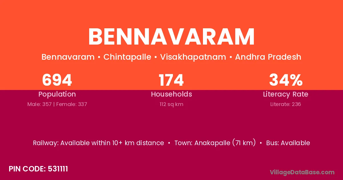 Anakapalle (88 km) is the nearest town to Bennavaram village for major economic activities and is located approximately 88 km away.