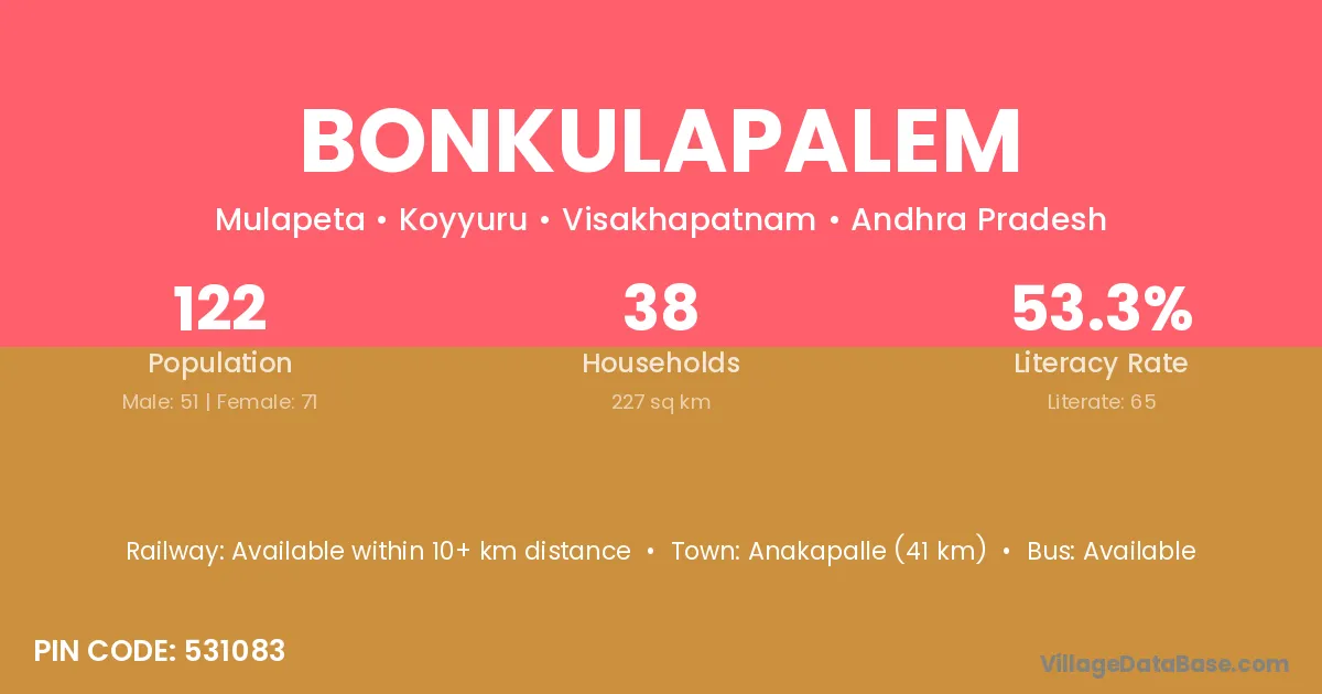 Anakapalle (41 km) is the nearest town to Bonkulapalem village for major economic activities and is located approximately 41 km away.