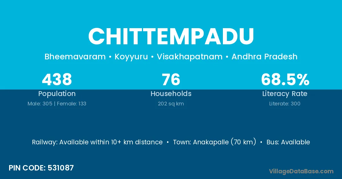 Anakapalle (70 km) is the nearest town to Chittempadu village for major economic activities and is located approximately 70 km away.