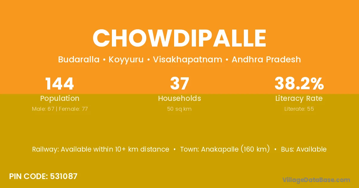 Chowdipalle village has a total population of 144 people, of which 67 are males and 77 are females.