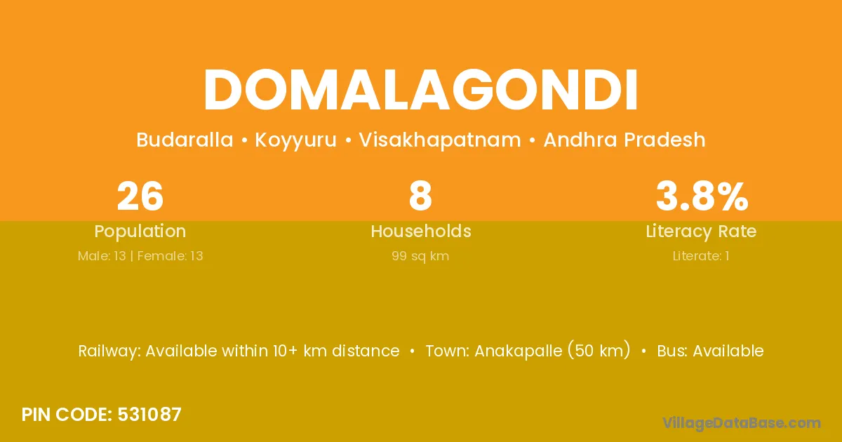 Anakapalle (50 km) is the nearest town to Domalagondi village for major economic activities and is located approximately 50 km away.