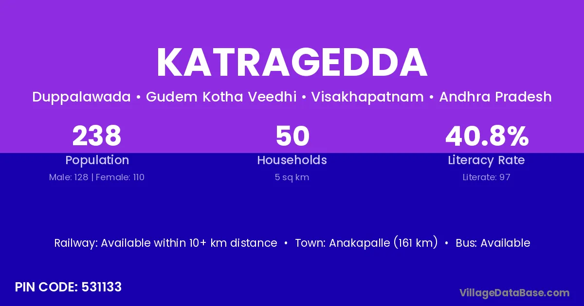 Anakapalle (60 km) is the nearest town to Katragedda village for major economic activities and is located approximately 60 km away.