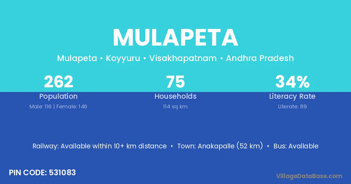 Anakapalle (52 km) is the nearest town to Mulapeta village for major economic activities and is located approximately 52 km away.