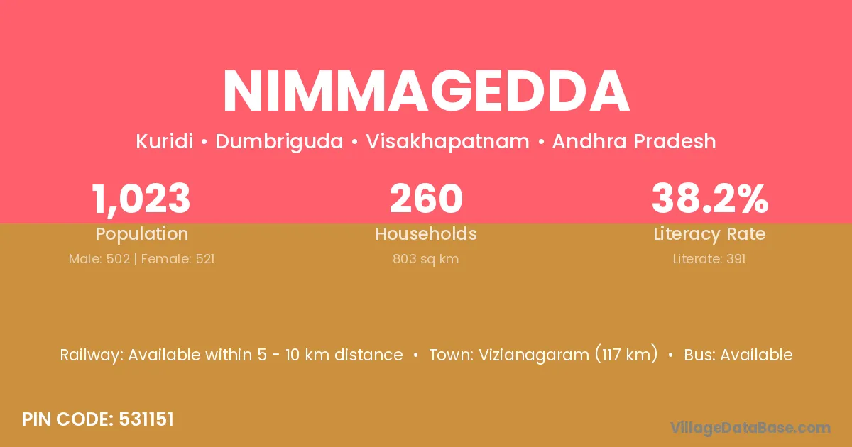Anakapalle (85 km) is the nearest town to Nimmagedda village for major economic activities and is located approximately 85 km away.