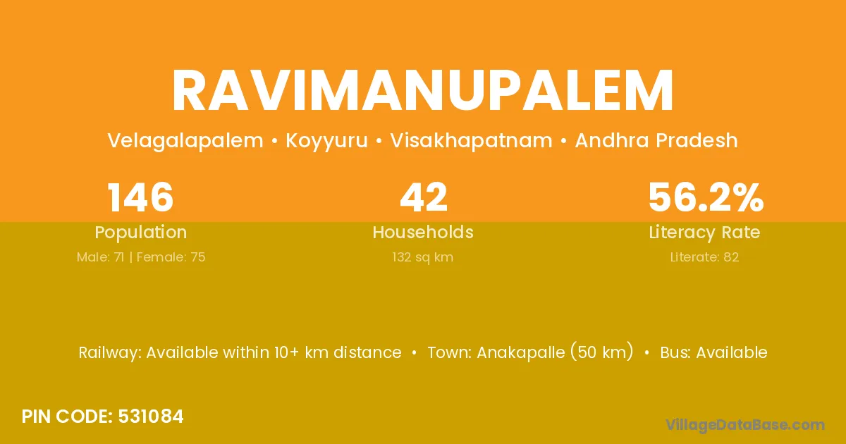 Anakapalle (50 km) is the nearest town to Ravimanupalem village for major economic activities and is located approximately 50 km away.