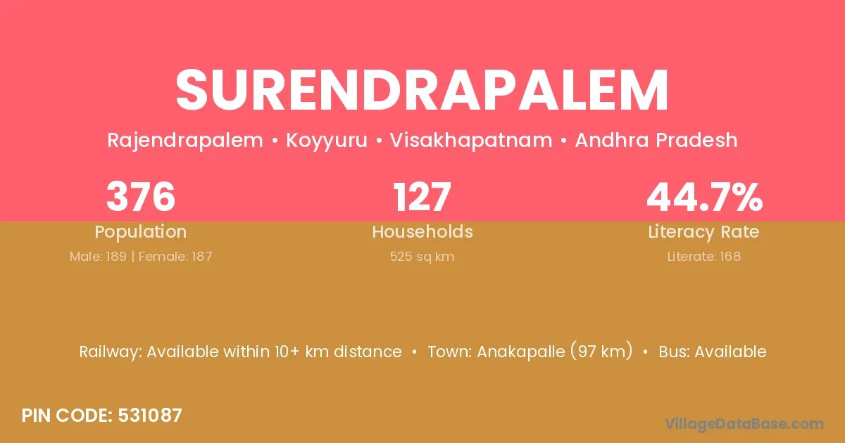 Surendrapalem village has a total population of 376 people, of which 189 are males and 187 are females.