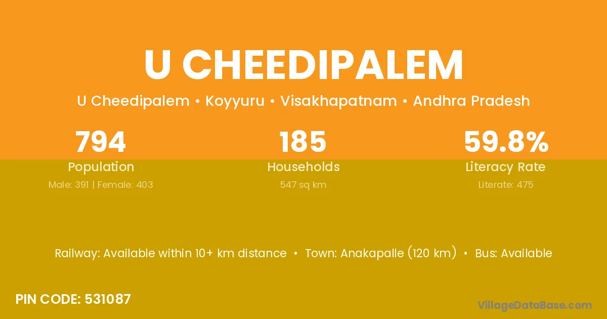 According to Census 2011 information, the village code of U Cheedipalem village is 531087.