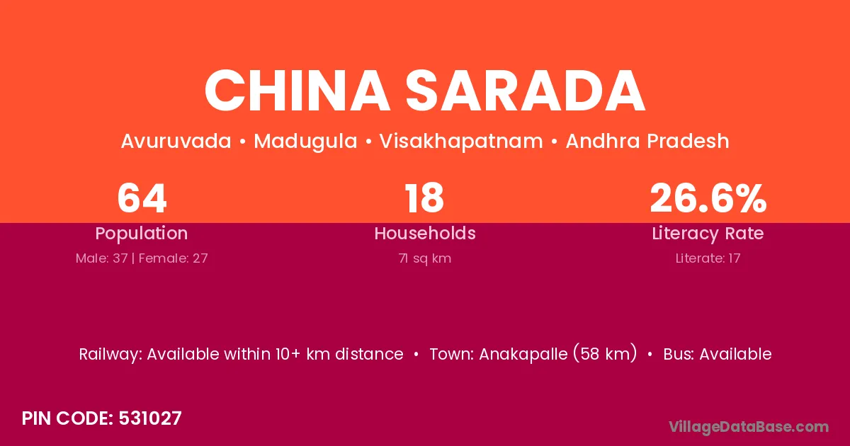 Anakapalle (58 km) is the nearest town to China Sarada village for major economic activities and is located approximately 58 km away.