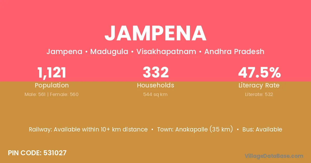 Anakapalle (35 km) is the nearest town to Jampena village for major economic activities and is located approximately 35 km away.