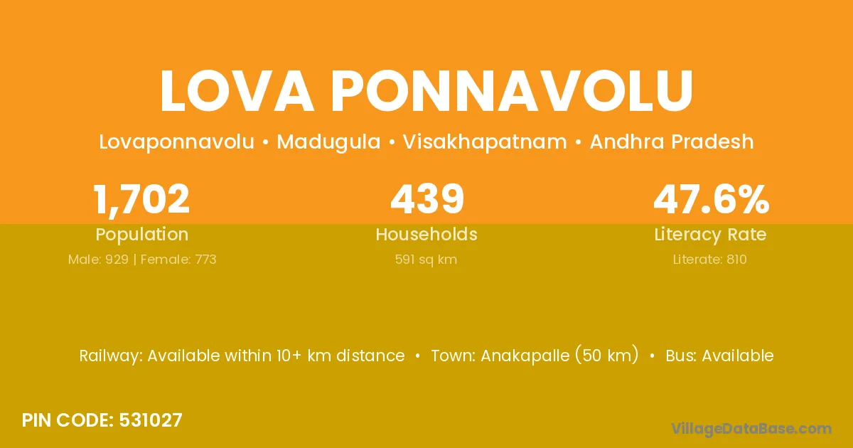 Anakapalle (50 km) is the nearest town to Lova Ponnavolu village for major economic activities and is located approximately 50 km away.