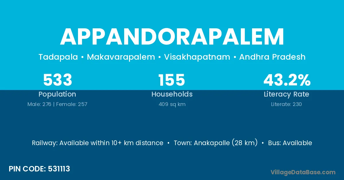 According to Census 2011 information, the village code of Appandorapalem village is 531113.