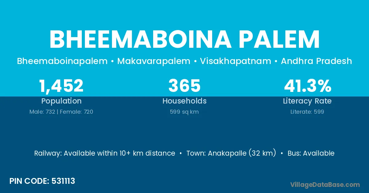 Bheemaboina Palem village has a total population of 1,452 people, of which 732 are males and 720 are females.