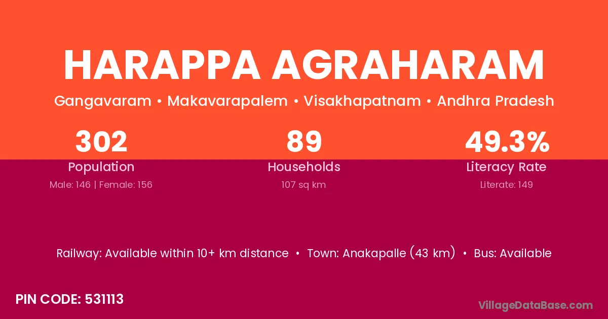 Anakapalle (43 km) is the nearest town to Harappa Agraharam village for major economic activities and is located approximately 43 km away.