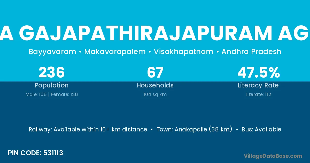 Narayana Gajapathirajapuram Agraharam village has a total population of 236 people, of which 108 are males and 128 are females.