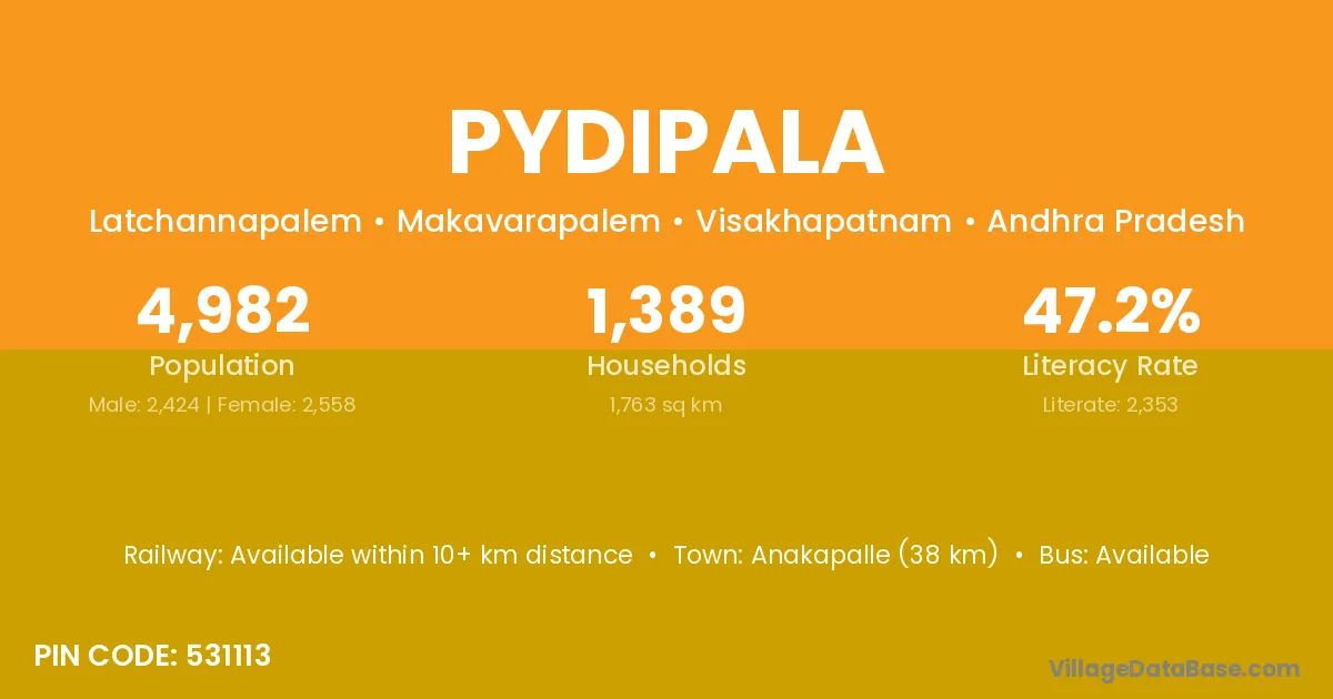 Anakapalle (38 km) is the nearest town to Pydipala village for major economic activities and is located approximately 38 km away.