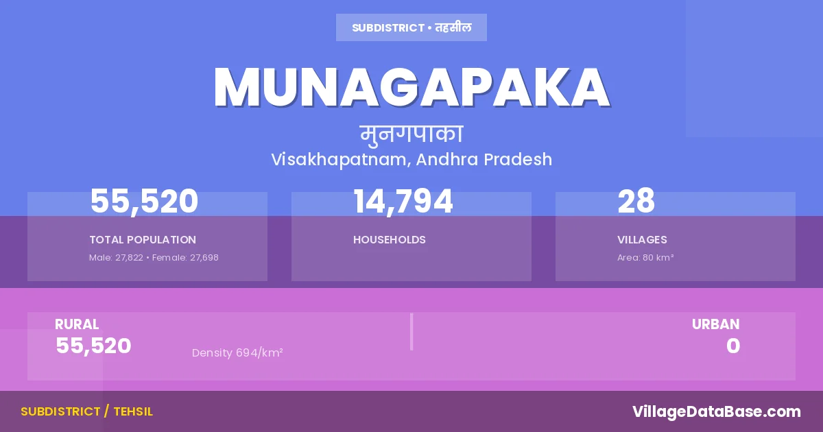 According to the 2011 census The total area of Munagapaka Mandal is 80 km², with a population of 55520 people. The population density is 694 inhabitants per square kilometre, and there are approximately 14794 houses in the sub district.