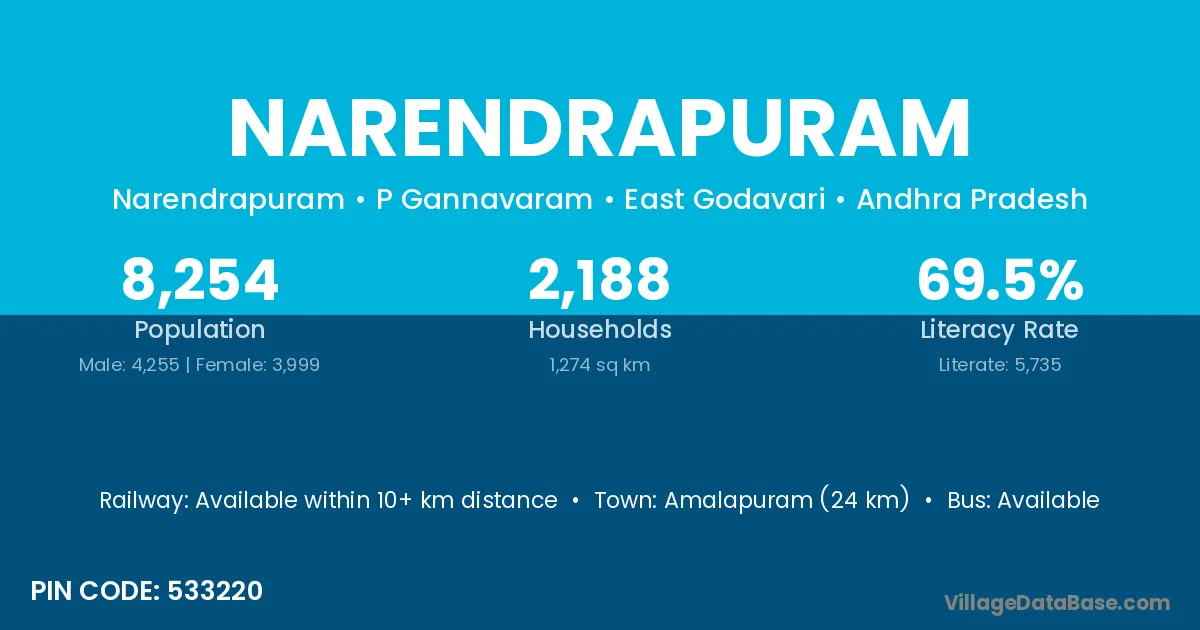 Anakapalle (18 km) is the nearest town to Narendrapuram village for major economic activities and is located approximately 18 km away.
