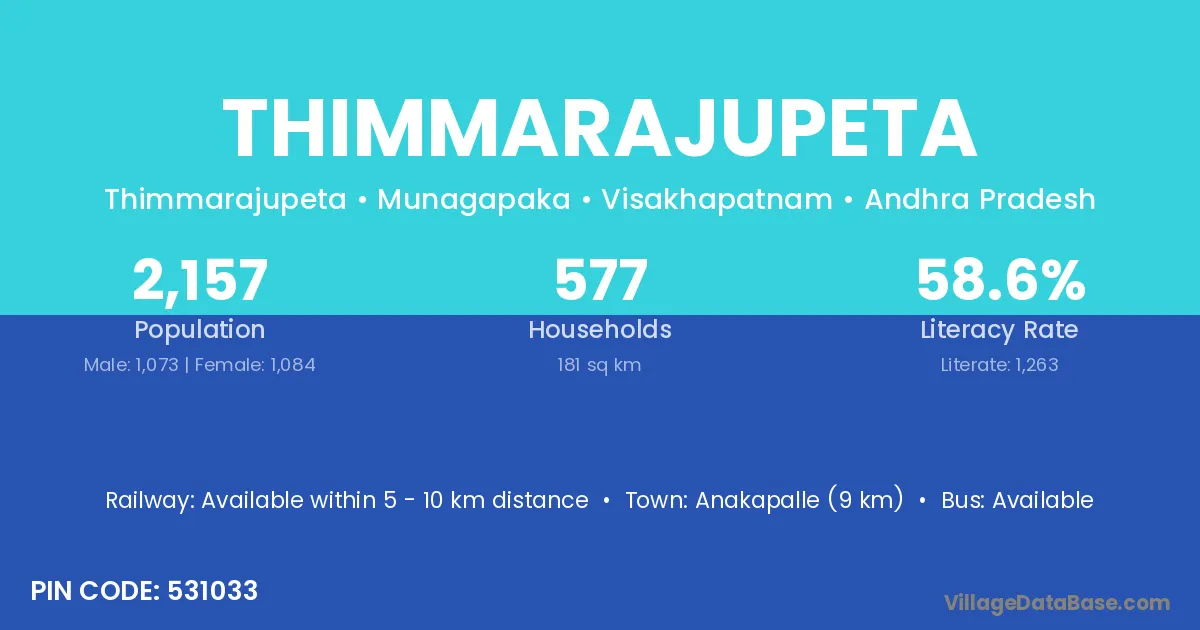 Anakapalle (9 km) is the nearest town to Thimmarajupeta village for major economic activities and is located approximately 9 km away.