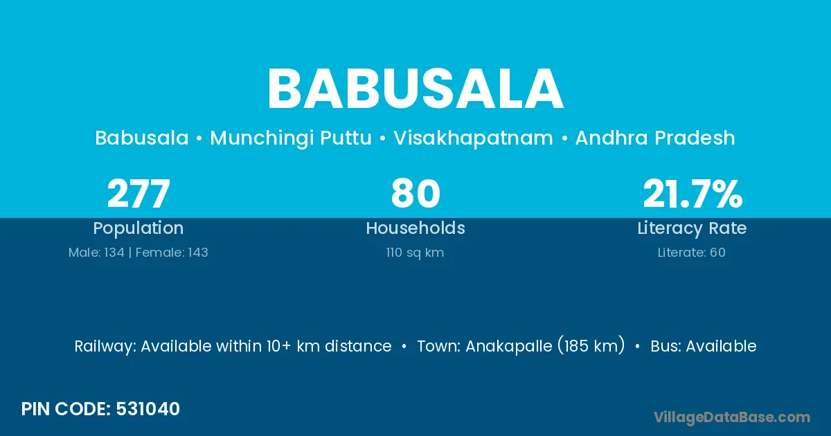 Anakapalle (185 km) is the nearest town to Babusala village for major economic activities and is located approximately 185 km away.