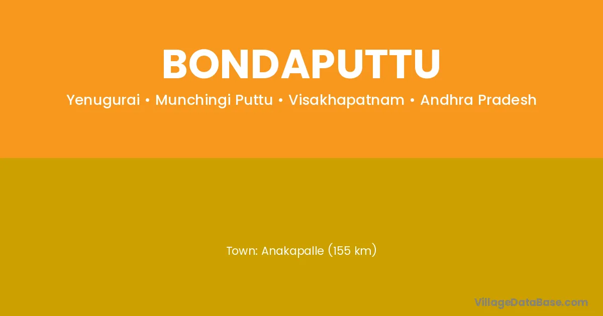 Anakapalle (155 km) is the nearest town to Bondaputtu village for major economic activities and is located approximately 155 km away.