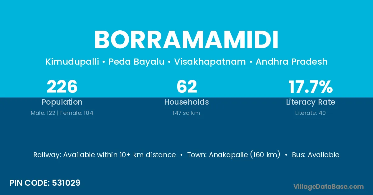 Anakapalle (99 km) is the nearest town to Borramamidi village for major economic activities and is located approximately 99 km away.