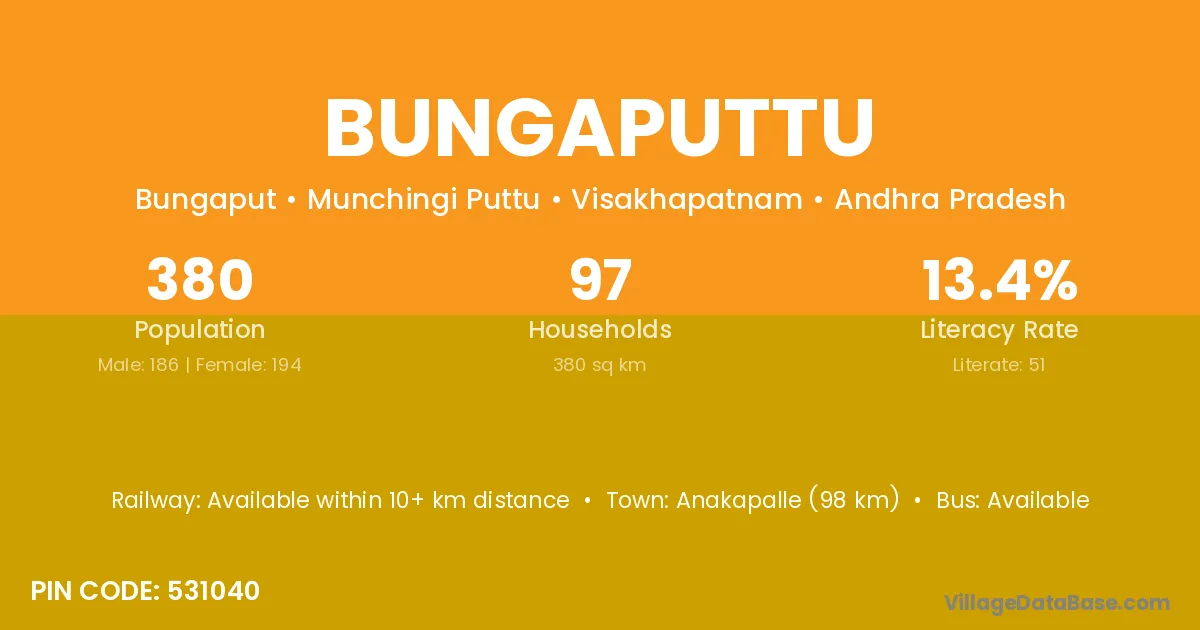 Anakapalle (98 km) is the nearest town to Bungaputtu village for major economic activities and is located approximately 98 km away.
