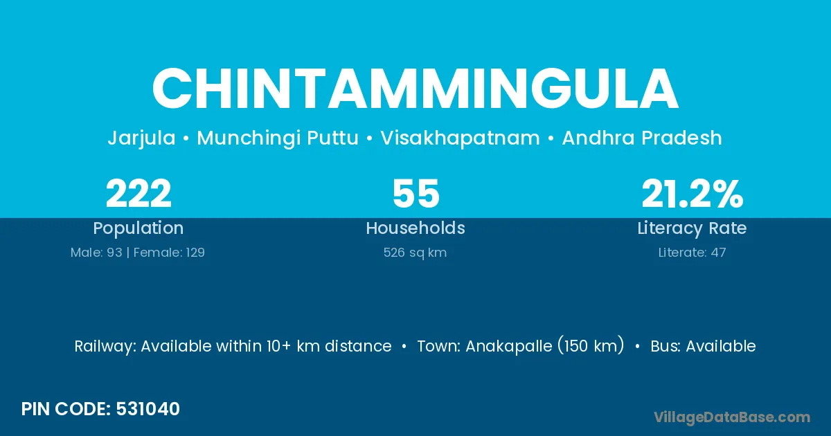 Chintammingula village has a total population of 222 people, of which 93 are males and 129 are females.