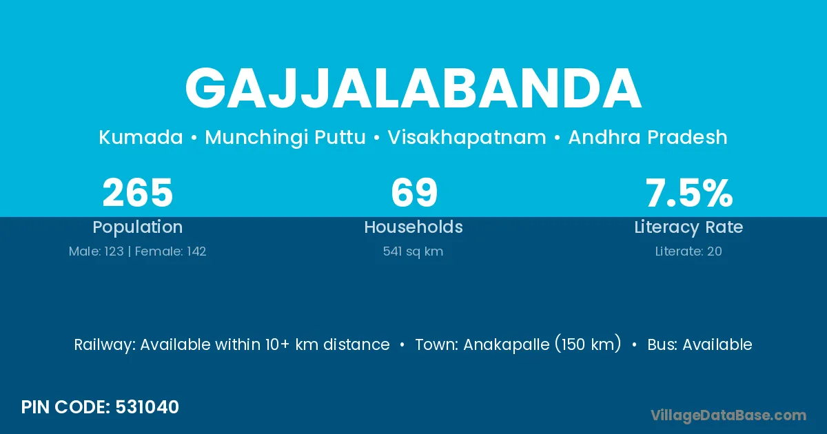 Anakapalle (150 km) is the nearest town to Gajjalabanda village for major economic activities and is located approximately 150 km away.