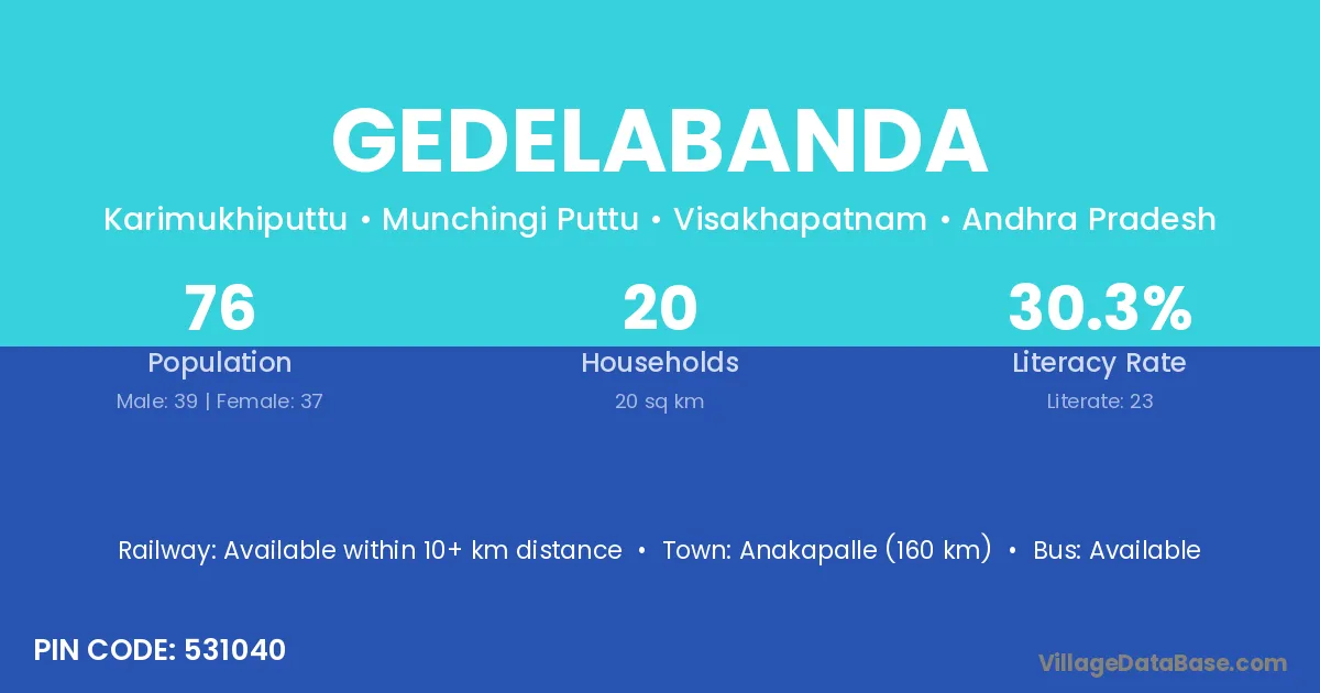 The literacy rate of Gedelabanda village is 30.26%. Male literacy stands at 38.46% and female literacy at 21.62%.