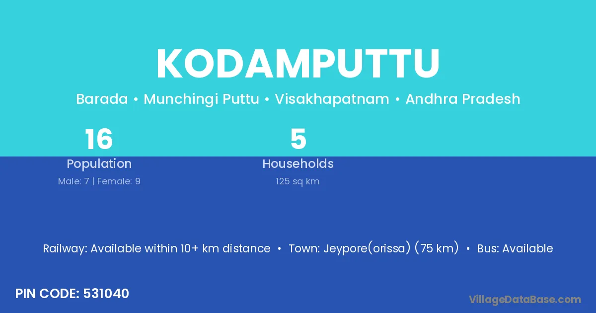 Jeypore(orissa) (75 km) is the nearest town to Kodamputtu village for major economic activities and is located approximately 75 km away.