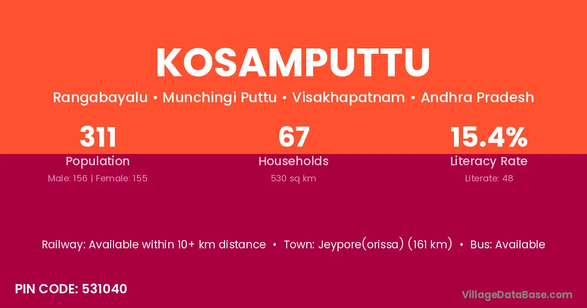 Kosamputtu village has a total population of 311 people, of which 156 are males and 155 are females.