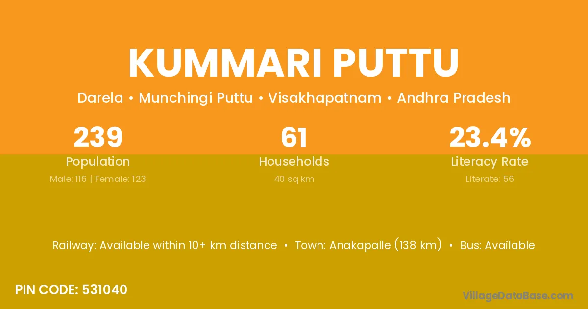Anakapalle (138 km) is the nearest town to Kummari Puttu village for major economic activities and is located approximately 138 km away.