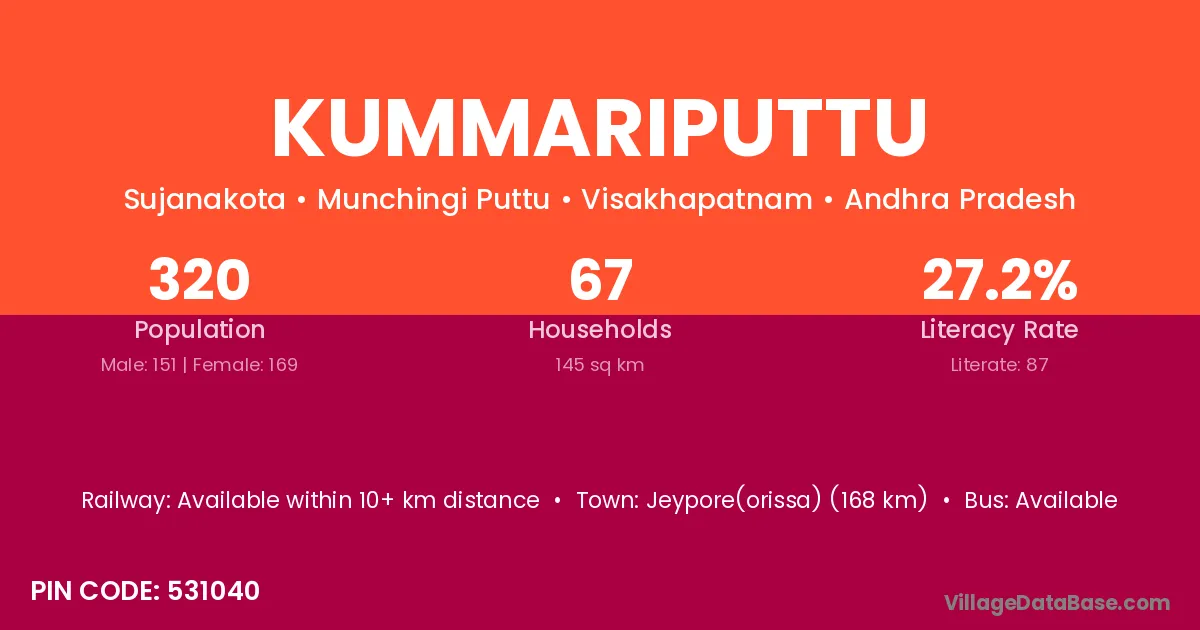 Jeypore(orissa) (168 km) is the nearest town to Kummariputtu village for major economic activities and is located approximately 168 km away.