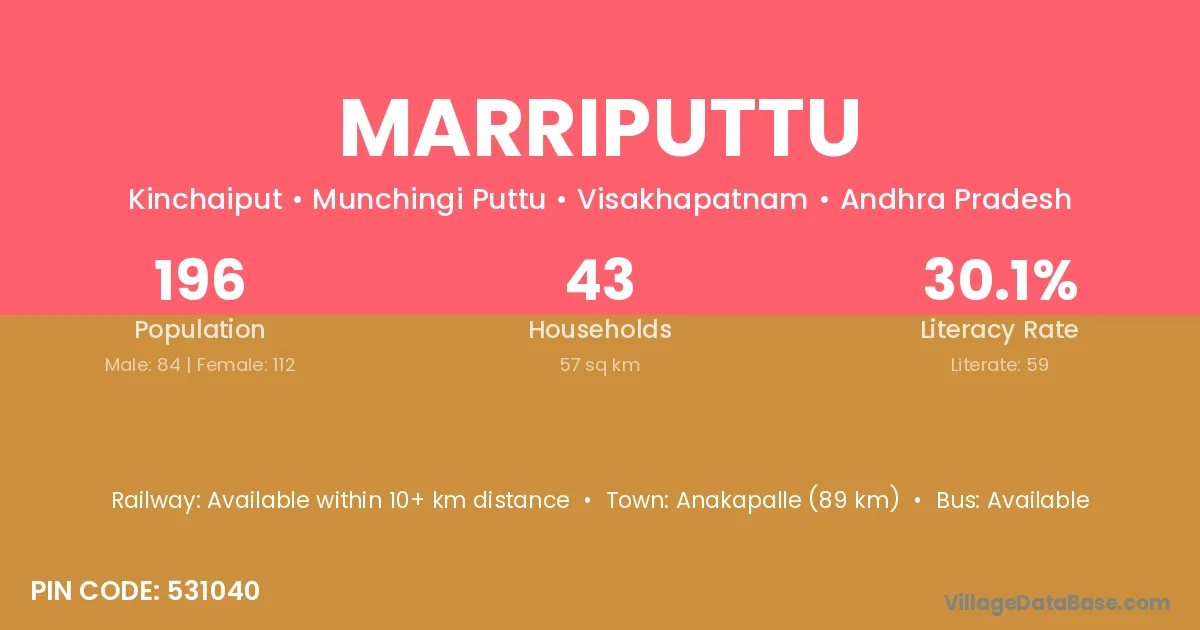 Marriputtu village has a total population of 196 people, of which 84 are males and 112 are females.
