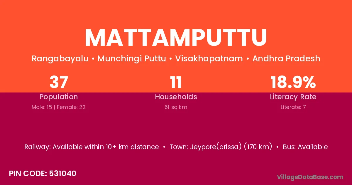 Mattamputtu village has a total population of 37 people, of which 15 are males and 22 are females.