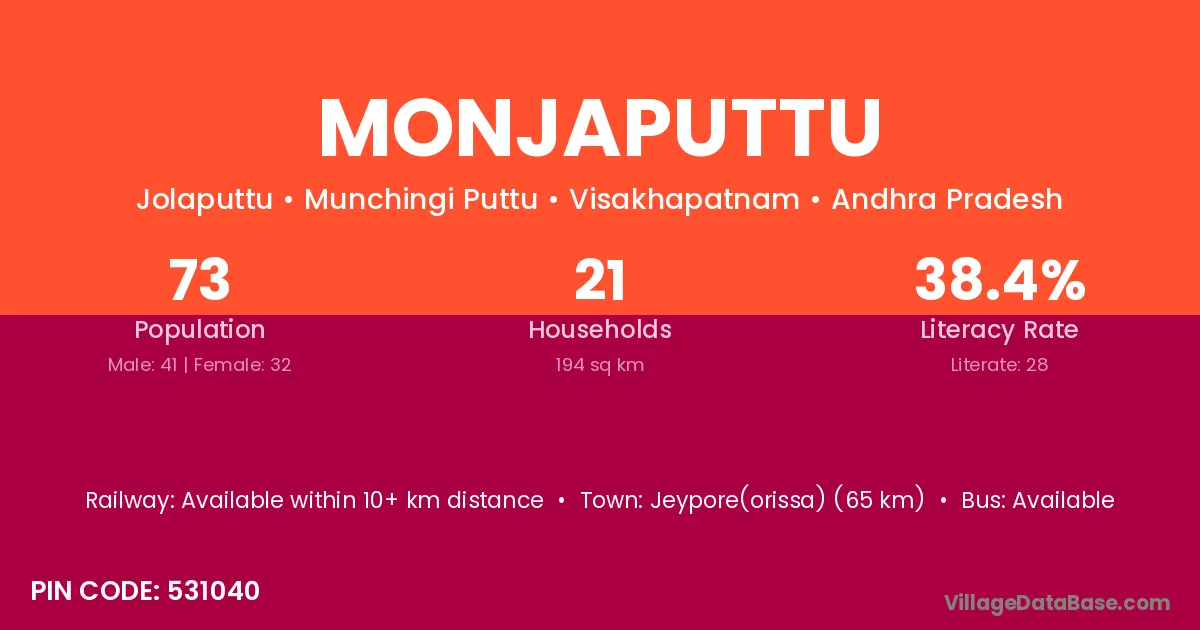 Monjaputtu village has a total population of 73 people, of which 41 are males and 32 are females.